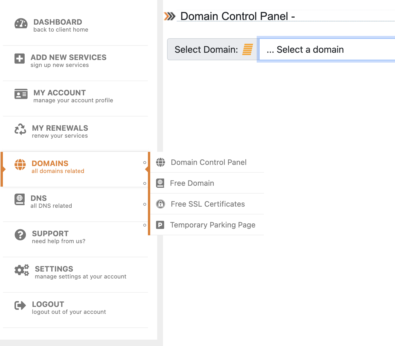 DOMAINS에서 발급받은 도메인 확인 가능하다. ...Select a domain을 누르면 내가 발급받은 도메인들이 나오며 네임서버나 IP 수정 가능하다.