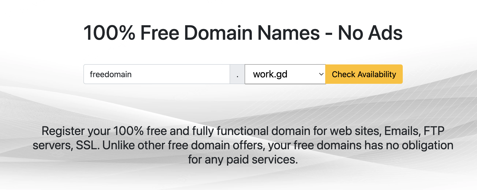 freedomain은 2차 도메인을 제공한다. 사진처럼 freedomain명으로 등록하고 싶다면 freedomain(3차).work(2차).gd(국가코드최상위도메인) 형태의 주소를 제공받는다. 보이는 화면에 원하는 도메인 명을 입력하고 2차도메인을 선택하고 Check Availablity를 클릭하면 이용가능한 주소일 경우 로그인 로그아웃 페이지로 이동한다.
